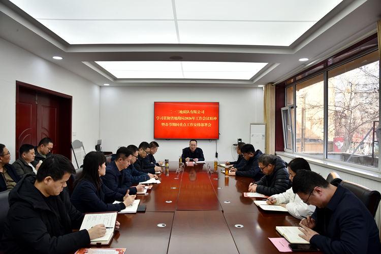 2月12日下午,二一三队有限公司召开学习贯彻省地勘局2026年工作会议精神暨春节期间重点工作安排部署会。公司党委书记、董事长赵江涛主持会议并讲话,公司领导班子成员、各经营单位、管理部门负责人参加会议。